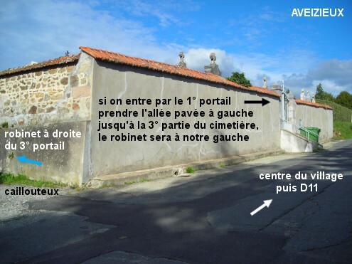 Le cimetière est implanté en périphérie du village, au lieu-dit La Perrière. A partir de la D11 en provenance de Chazelles-sur-Lyon, au niveau d'un virage à gauche, tourner à droite dans la route du Verjollat en suivant le fléchage ''Mairie'' et ''cimetière''. Après avoir passé la Mairie sur une grande place côté droit, on verra plus loin le cimetière à droite lui aussi. Il est composé de trois parties. Le robinet est à l'intérieur de la troisième partie qui est la plus éloignée de la route. Deux accès sont possibles. 1- Entrer par le premier portail côté rue et prendre les allées pavées intérieures pour longer le mur gauche jusqu'à la troisième partie, le robinet est alors à gauche juste derrière le mur séparant deuxième et troisième partie. 2- Ou bien, prendre l'allée caillouteuse longeant extérieurement le mur gauche du cimetière jusqu'au troisième portail en face, le robinet est dans ce cas à droite juste après l'angle du mur.