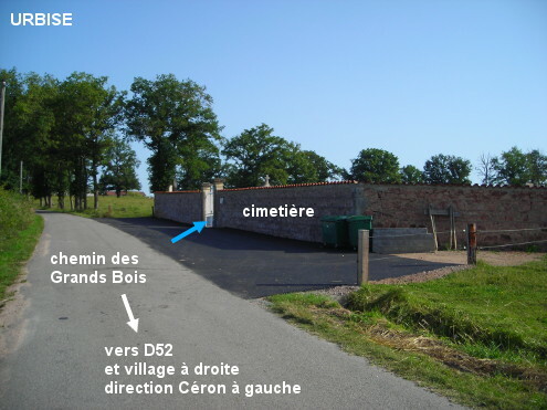 Le cimetière est situé à l'extérieur du village au bord d'une route secondaire, à 250 mètres de la D52 direction Céron. A partir de l'intersection D490 / D8 / D52, prendre la D52 direction Céron (il y a aussi une flèche ''cimetière''), et 250 mètres plus loin (après le panneau de fin de village) tourner à gauche en suivant encore la flèche indiquant le cimetière. Celui-ci est implanté côté droit 250 mètres plus loin. Le robinet est à l'intérieur du cimetière, à droite du portail.