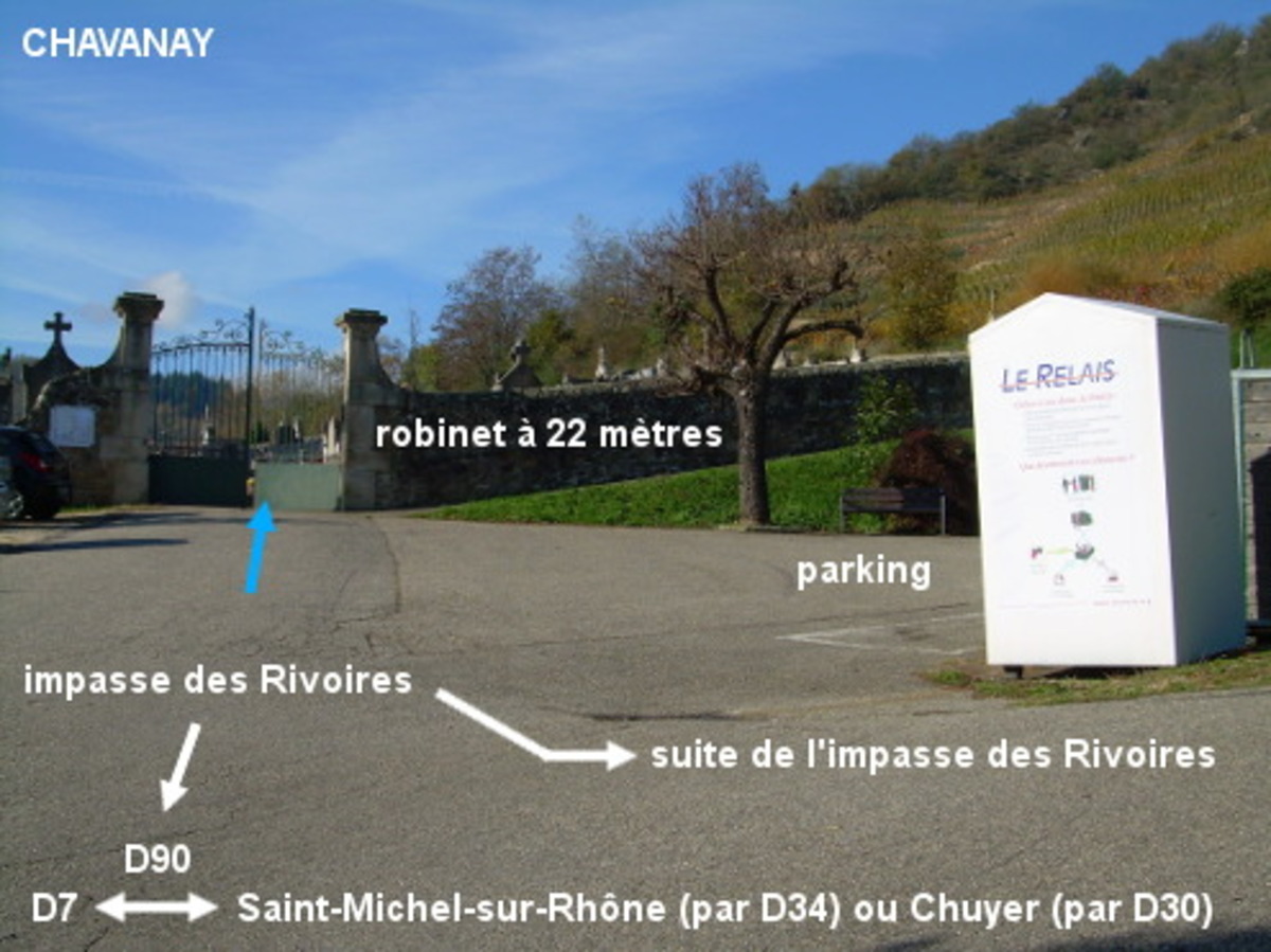 Le cimetière (fléché) est situé au fond d'une impasse, à 120 mètres de la D90 quand on monte en direction de Saint-Michel-sur-Rhône. Le robinet est à l'intérieur du cimetière au bord de l'allée qui est face au portail et à 22 mètres de celui-ci. 1) Sur la D7 en provenance de Pélussin (en novembre 2025 la route était encore coupée suite à l'effondrement d'un pont à cause des crues du 17 octobre 2024) et avant le centre-ville, tourner à gauche en direction de Saint-Michel-sur-Rhône dans la D90 puis 120 mètres après tourner à gauche en direction du cimetière. Rouler tout droit jusqu'à arriver face à son portail (à 120 mètres), tandis que la rue vire à droite juste avant. Entrer et avancer sur l'allée asphaltée pour trouver le robinet fixé sur un piquet à sa gauche et à 22 mètres du portail. 2) En provenance de Saint-Michel-sur-Rhône sur la D34 puis la D90, dans la descente il faut être attentif pour ne pas louper (juste après un virage à gauche) la rue à droite qui mène au cimetière (cf flèche) située environ 580 mètres après le panneau marquant le début de la ville.