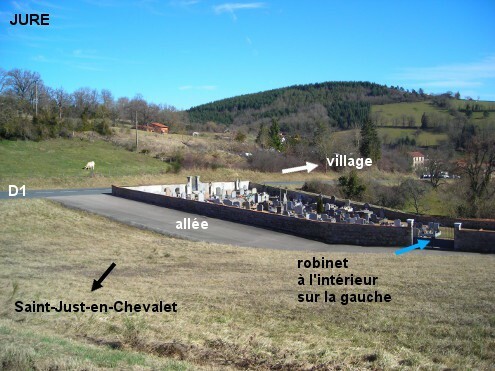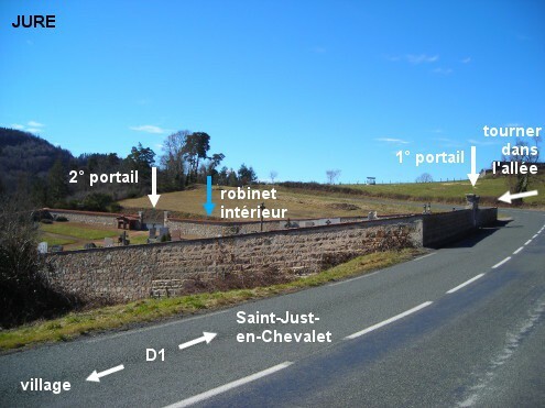 Le cimetière est implanté côté gauche peu après la sortie du village sur la D1 en direction de Saint-Just-en-Chevalet. Son premier portail est situé environ 110 mètres après le panneau de fin de village, mais c'est par le deuxième portail qu'il est préférable d'entrer. Pour accéder à celui-ci, 40 mètres après le premier portail, tourner à gauche dans l'allée de 40 mètres qui dessert le deuxième portail. Entrer et faire dix pas sur la gauche pour trouver le robinet fixé au mur.