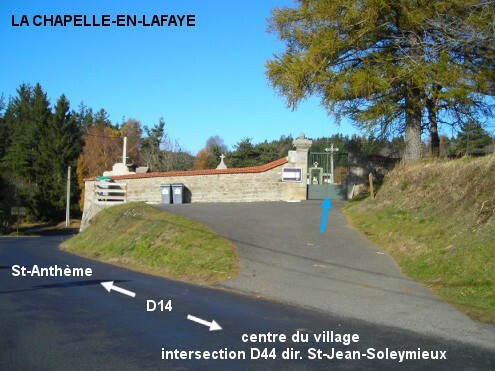 Le cimetière est implanté côté droit à la sortie du village sur la D14 en direction de Saint-Anthème, 250 mètres après l'intersection à droite avec la D44 direction Saint-Jean-Soleymieux, au niveau du panneau de fin du village. Il est desservi par une courte allée d'environ 30 mètres. Le robinet est à l'intérieur du cimetière, à gauche du portail.