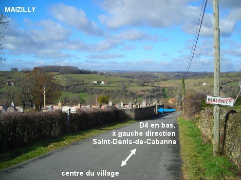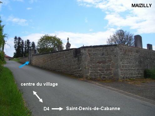 Le cimetière est situé dans une rue secondaire à la périphérie du village, à 280 mètres du carrefour au centre du bourg, ou à 530 mètres de la D4. Deux accès sont possibles selon son itinéraire. 1) En provenance de Mars par la D66, quand on arrive au carrefour au centre du bourg vers l'église, tourner à droite dans le chemin de la Goutte Dine en direction de Saint-Denis-de-Cabanne (les flèches directionnelles sont très petites), puis deux fois à droite en suivant les flèches ''cimetière''. Celui-ci est implanté côté gauche (face au n°248 chemin du Cimetière) 30 mètres après le panneau de fin de village. Le robinet est à l'intérieur du cimetière, à droite du portail. 2) Sur la D4 en direction de Saint-Denis-de-Cabanne, juste avant le panneau de fin de village, tourner à gauche en suivant les flèches ''Maizilly 1'' et ''Mairie'', et grimper dans cette rue à la pente soutenue, jusqu'au cimetière implanté côté droit.