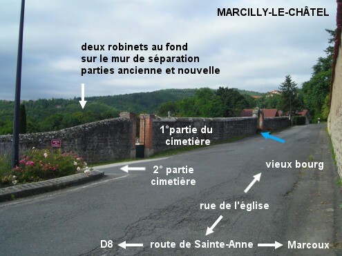 Le cimetière est implanté en périphérie du vieux bourg et il est composé de deux parties dotées chacune d'un robinet. A partir de la "route de Sainte-Anne" en provenance de Marcoux, (en direction de la partie récente du village et de la D8), tourner à droite en direction du vieux bourg, le cimetière est implanté côté gauche quelques mètres plus loin à l'angle avec la "montée du Paradis" (qui descend à partir d'ici). Ne pas entrer par le portillon que l'on voit en premier, mais par le portail plus loin. Longer les murs à droite jusqu'au coin en diagonale où il y a un appentis à l'angle avec la deuxième et nouvelle partie du cimetière. Le premier robinet est fixé sur le mur sous cet appentis. Le deuxième robinet est fixé de l'autre côté du mur de séparation des deux parties du cimetière, à droite des escaliers qui descendent dans la nouvelle partie. On peut accéder plus facilement à ce deuxième robinet en entrant par le portail situé montée du Paradis : à partir de cet autre portail c'est tout droit jusqu'au mur du fond, le robinet sera côté droit.