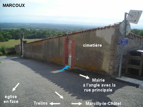 Le cimetière est situé dans le village à proximité de l'église. A partir de la voie C4 en provenance de Montverdun, lorsque l'on voit la Mairie à droite, tourner à droite juste derrière. Quelques mètres plus loin on verra l'église à gauche et un peu plus bas sur la droite, derrière le deuxième parking côté droit, on verra le cimetière. Entrer par le portillon, le robinet est à l'intérieur, à gauche de ce portillon.