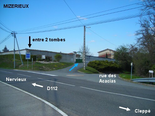 Le cimetière est situé en dehors du village au bord de la D112, côté droit en direction de Nervieux, accessible au début de la rue des Acacias. Le robinet est à l'intérieur du cimetière, à gauche du portail vers le coin au fond et entre deux tombes.