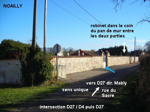 Le cimetière est situé à 260 mètres de l'intersection sud D27 / D4 (celle qui est en face de l'église). Sur la D4 en provenance de Saint-Germain-Lespinasse, tourner à droite sur la D27 en direction de Mably, puis 130 mètres plus loin, au niveau du passage piéton, tourner à gauche en suivant la flèche ''le cimetière''. Celui-ci est implanté côté gauche 130 mètres plus loin. Entrer par le premier portail (celui de gauche) qui donne dans l'ancienne partie du cimetière, se diriger vers la droite pour trouver le robinet dans le coin du pan de mur faisant séparation avec la deuxième et nouvelle partie du cimetière. N.B. : Si l'on continue dans la rue du Sacre, qui est à sens unique presque jusqu'à son autre extrémité, on retrouve 460 mètres plus loin la D27 direction Mably.