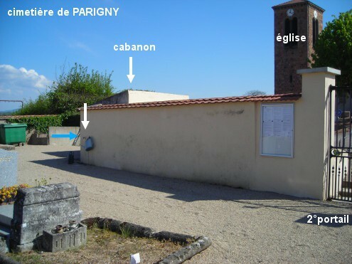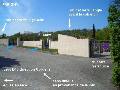 Le cimetière est situé dans une rue secondaire, à proximité de l'église, à 60 mètres de la D45. Sur la D45 en provenance de Pradines, après une côte et entre les deux courbes d'un S, avant d'arriver vers l'église, tourner à droite dans la rue étroite au début que laquelle il y a une flèche ''école''. Au sommet de la courte côte de 60 mètres on verra le cimetière côté droit, en regard de l'église érigée à gauche derrière une grande place. Le cimetière comporte trois portails et deux robinets. Si l'on entre par le deuxième portail, on trouvera un robinet vers la droite au bout du mur qui fait alors un angle vers un cabanon et le premier portail (verrouillé). Si l'on entre par le troisième portail qui donne dans la partie la plus récente, on trouvera le deuxième robinet vers la gauche au milieu du mur avant. N.B. : En continuant dans cette rue en sens unique, on rejoint 110 mètres plus loin la D45 direction Cordelle (à droite), ou à vélo on peut couper par la rue de l'église (en face du cimetière).