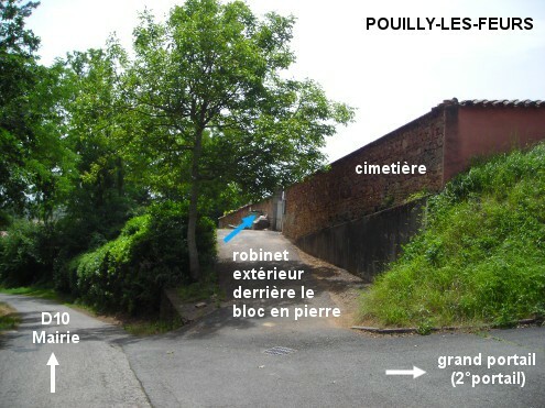 Le cimetière est situé à la périphérie de la Ville, en haut d'une côte, à 410 mètres de la D10. Sur la D10 en direction de Balbigny, juste après l'intersection avec la D58, tourner à droite devant la Mairie dans la rue de l'Egalité (il y a une flèche "rue du cimetière"). Monter dans cette rue (il y a des intersections avec des rues desservant des lotissements), la troisième à gauche est une allée qui dessert le cimetière. Ne pas prendre la perpendiculaire qui conduit au grand portail mais l'allée en épingle qui dessert un plus petit portail. Le robinet est à l'extérieur, à gauche de ce premier portail (il peut passer inaperçu à cause d'un gros bloc en pierre posé à côté du portail).