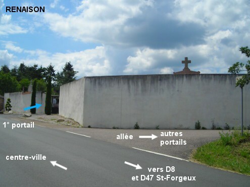 Le cimetière est implanté côté droit à l'entrée de Renaison sur la D47 en provenance de Saint-Forgeux-Lespinasse après l'intersection avec la D8. Il possède plusieurs entrées et six points d'eau au total, bien indiqués sur le plan figurant à l'extérieur à gauche du portail principal (face au n° 388 rue Caporal Goutaudier). Le premier robinet est à l'intérieur du cimetière à droite du portail principal, le deuxième à droite du deuxième portail (celui que l'on voit dans une allée à droite avant le cimetière). N.B.: Depuis le carrefour principal en centre-ville, la direction du cimetière est indiquée.