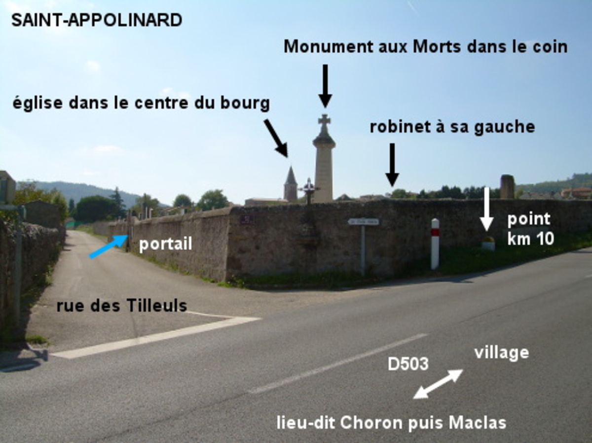 Le cimetière est situé en dehors du village à l'angle de la D503 direction Maclas (au niveau du point kilométrique 10) et de la rue traversant le centre du village. Le robinet est à l'intérieur du cimetière, dans le coin qui est à droite du portail. 1) En provenance de Maclas sur la D503 et après le lieu-dit Choron, en arrivant vers le point kilométrique 10 on verra le cimetière implanté côté gauche derrière le carrefour avec une rue adjacente (il n'y a qu'une flèche ''la croix verte'', et rien n'indique que cette rue mène au bourg si ce n'est l'église que l'on aperçoit au loin). Tourner à gauche dans cette rue des Tilleuls, entrer dans le cimetière et se diriger vers le coin à droite, dans lequel est érigée l'obélisque du Monument aux Morts. On trouvera le robinet immédiatement à gauche de l'emplacement de ce monument (à 30 mètres du portail). 2) En provenance de Saint-Julien-Molin-Molette sur la D503, traverser toute la partie du village qui est au bord de cette D503 puis 270 mètres après le panneau de fin de village, tourner à droite derrière le cimetière qui est dans l'angle du carrefour pour accéder à son portail. Entrer et se diriger vers l'obélisque dans le coin à droite pour trouver le robinet à sa gauche.
