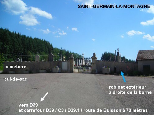 Le cimetière est implanté au fond d'une courte rue en impasse, à 70 mètres du carrefour entre la D39 (de Belmont-de-la-Loire à Azolette), la D39.1 (en direction du bourg et de Chauffailles pour les moins de 7,5 tonnes) et la ''route de Buisson''. A ce carrefour, prendre la D39 direction Azolette puis ignorer la voie C3 (menant au lieu-dit Fénier) qui est immédiatement à droite, pour tourner juste après à droite en direction du cimetière. Celui-ci est alors en face au bout du court faux-plat montant. A l'extérieur du cimetière, sur son mur avant et à droite du portail, il y a un robinet (à droite d'une ancienne borne de couleur noire qui ne fonctionne plus).