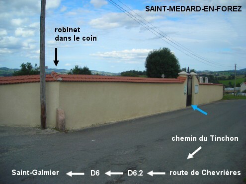 Le cimetière est en périphérie du village, à 130 mètres de la rue principale (route de Chevrières). En provenance de Chevrières par la D6 et après un court tronçon de D11, prendre à droite la direction de Saint-Médard-en-Forez. A l'entrée du village tourner à droite en suivant la flèche ''cimetière'' (côté gauche il y a une croix). Ignorer le premier portail (verrouillé) qui est en retrait par rapport à la route, pour entrer par le deuxième portail qui est directement au bord de la route. Le robinet est à l'intérieur, à gauche de ce portail, dans le coin un peu plus loin.
