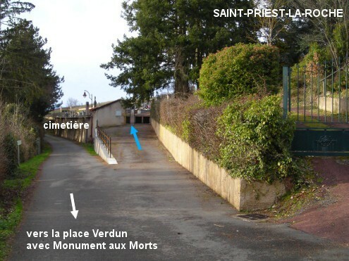 Le cimetière est situé dans une rue secondaire, à 190 mètres de la place Verdun sur laquelle est érigée l'obélisque du Monument aux Morts, elle-même située non loin de l'église. Sur la D56 en provenance de Cordelle, tourner à gauche (voie C1) en ayant mis ''tout à gauche'' pour grimper le kilomètre de côte à 20% sur presque toute sa longueur. Au sommet, continuer sur la gauche pour arriver place Verdun où une flèche indique la direction du cimetière à gauche. Environ 150 mètres plus loin, une allée goudronnée sur la branche droite d'un Y conduit au cimetière. Le robinet est à l'intérieur du cimetière, sous l'abri d'un cabanon en ciment à gauche du portail. N.B. : Pour éviter le raidard menant au village, on peut faire un détour en continuant sur la D56, prendre alors la suivante à gauche : la D42 direction Vendranges puis la D17 à gauche en direction du village. Dans ce cas, aller jusqu'à l'église, tourner à droite jusqu'à la place Verdun et continuer tout droit jusqu'au cimetière.