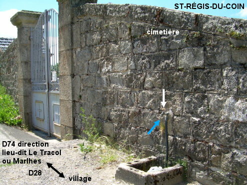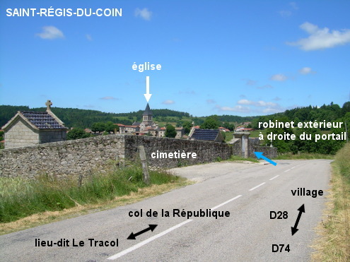 Le cimetière est situé en dehors du village, au sud sur la D28, quand on suit la flèche indiquant la direction de Saint-Sauveur-en-Rue (par la D503 à très grande circulation !). Le robinet est à l'extérieur, à droite du portail. 1) En provenance de Saint-Sauveur-en-Rue (prendre la D22 en direction du col de la République et 3 km après le carrefour D22 / D503, tourner à gauche dans la ''route de Morel'', puis au carrefour en T tourner à gauche, à la sortie du lieu-dit Les Clavassous au carrefour où il y a une croix prendre à gauche la ''route de Gimel'' qui descend : elle débouchera sur la D28, à prendre à droite) en passant par des petites routes pour rejoindre la D28, on arrivera peu après vers le cimetière implanté côté gauche, avant le village dont on aperçoit l'église au loin. 2) En provenance de Marlhes sur la D501 puis la D74 et enfin la D28, on arrivera de même vers le cimetière implanté côté gauche peu après avoir rejoint la D28. 3) En provenance de Saint-Genest-Malifaux sur la D22 puis la D28, traverser tout le village, 370 mètres après le panneau de fin de village on sera à côté du robinet du cimetière implanté côté droit.