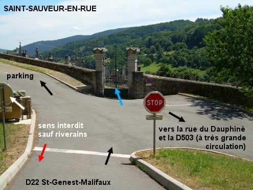Le cimetière (pas simple à trouver) est situé dans une rue secondaire, à 120 mètres de la D22 direction Saint-Genest-Malifaux. En provenance de Burdignes sur la D22, après l'intersection avec la D503 à très grande circulation, suivre le virage à droite de la D22, plus loin dépasser l'église érigée côté droit. Juste après celle-ci et près d'une statue de Poilu, il y a une flèche ''cimetière'' tout droit sur la D22, prendre ce point de repère et monter pendant environ 390 mètres puis tourner dans la deuxième rue à droite (sur un carrefour en Y). Elle se met à descendre et au stop en bas on sera en face du portail du cimetière. Entrer pour trouver le robinet à gauche à trois pas. P.S. : La rue qui descend vers le cimetière est en sens unique, mais à vélo et en étant prudent on peut remonter ce ''sens interdit sauf riverains'' pour retourner sur la D22 direction Saint-Genest-Malifaux.