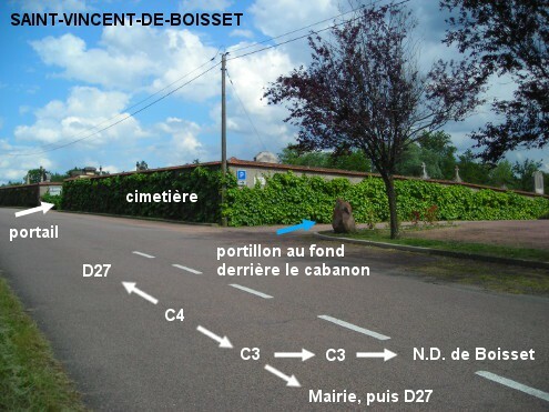 Le cimetière est situé à proximité immédiate de l'intersection entre la voie C4 (route du Tonnelier) et la C3 (route de Notre-Dame), à 140 mètres de la Mairie. Le plus simple est d'entrer par le portillon sur la droite du cimetière (derrière un cabanon qui le masque à la vue) et au fond de la place en terre battue sur laquelle il y a le Monument aux Morts, plutôt que par le portail principal route du Tonnelier. La pompe à eau est en effet située à l'intérieur tout près du portillon annexe (depuis celui-ci, on voit la pompe à eau en face vers la droite un peu plus loin après le columbarium). Actionner la manivelle vers l'avant et vers le haut de manière énergique pour faire couler l'eau. N.B. : Pour trouver le cimetière. 1) A partir de la D27 en provenance du Coteau, tourner à droite sur la voie C3 direction St-Vincent et suivre cette route (route de la Mairie) jusqu'à l'intersection à droite avec la route de Notre-Dame, le cimetière est juste après sur le côté droit (620 mètres après le panneau de début du village). 2) En provenance de Pradines sur la D27, au lieu-dit les Ripes tourner à gauche (on voit le panneau d'entrée dans St-Vincent) dans le Chemin de la Croix Duret qui se prolonge en rue du Maréchal Ferrant puis route du Tonnelier. Le cimetière est à la fin de cette voie, côté gauche juste avant l'intersection avec la route de Notre-Dame.