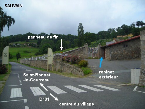 Le cimetière est implanté côté droit à la sortie du village sur la D101 en direction de Saint-Bonnet-le-Courreau, au niveau du panneau marquant la fin du village. Une courte allée dessert le cimetière dont le portail se trouve face à nous. Le robinet est à l'extérieur, à droite du portail, dans le coin entre le portail et le cabanon extérieur.
