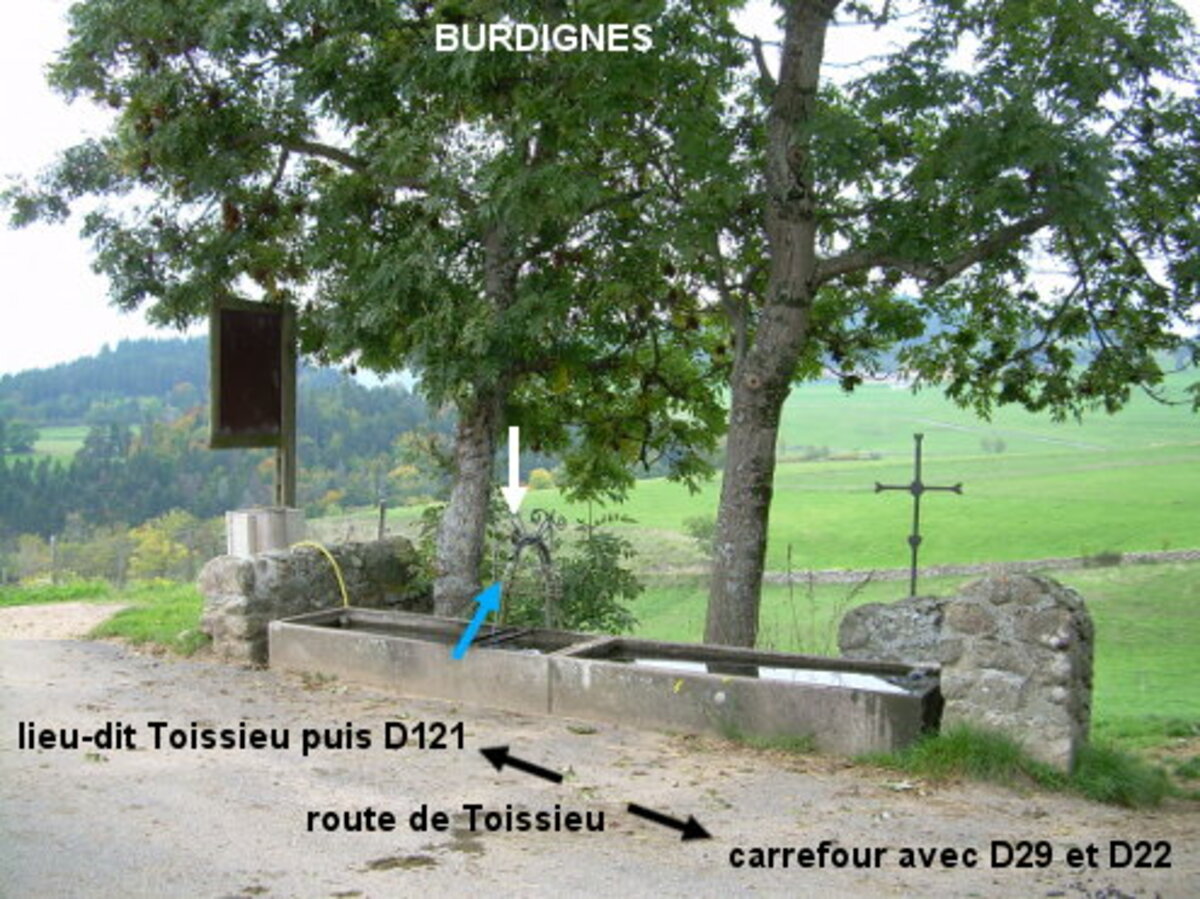 La fontaine se trouve dans la rue qui mène au cimetière, à 260 mètres de la D29 près de son carrefour avec la D22. AVERTISSEMENT : Dans la ferronnerie support de la buse d'écoulement, est inclus le message ''eau non surveillée''. En provenance de Vanosc sur la D570 qui devient D29 en changeant de département, juste après le carrefour à gauche avec la D22 venant de Saint-Sauveur-en-Rue tourner à droite dans la rue dont le début est très large (il y a une flèche ''cimetière'' parmi d'autres). Suivre le virage à droite puis surveiller le bord droit de la route pour repérer la fontaine qui s'écoule dans un bassin rectangulaire en pierre devant deux arbres et juste avant l'accès à la cour d'une ferme. P.S. : Si l'on préfère refaire le plein de ses bidons avec de l'eau du réseau, on peut continuer jusqu'au cimetière (à 130 mètres). N.B.: Sur l'extérieur du virage à droite précité après le début de la rue, il y a un ancien lavoir avec un autre bassin à l'extérieur mais celui-ci était à sec et cette fontaine-là ne coulait pas en octobre 2025.
