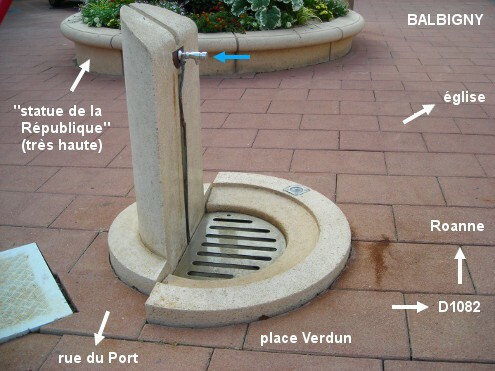Le robinet de type fontaine est implanté à côté de la très très haute "statue de la République" sur une place le long de la D1082. Sur la D1082 en direction de Roanne, peu après les feux tricolores (intersection avec la D1), cette place se trouve à l'angle de la rue du Port côté gauche, et avant la rue de la Cure côté droit qui longe l'église.
