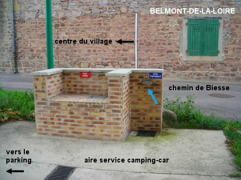 L'aire pour camping-car se trouve en bordure du grand parking des Arcades situé dans une rue secondaire, et elle est fléchée à partir du rond-point D31 / D4 proche de l'église. 1) En provenance de Chauffailles sur la D31 (ou de Belleroche sur la D4), au rond-point continuer tout droit en direction du centre-ville et en suivant la flèche avec le pictogramme pour les camping-car, puis 50 mètres après tourner dans la première à droite toujours en suivant le panneau pour camping-car. Continuer pendant 230 mètres jusqu'à la fin du grand parking implanté côté droit, pour trouver à côté du pictogramme ad-hoc au bord de la route le bloc en pierres avec les robinets. C'est sur sa partie droite qu'est fixé le robinet accompagné de l'écriteau bleu ''eau potable''. Attention, sur ce robinet-vanne l'eau gicle fort et un demi-collier métallique placé dessous empêche d'approcher les bidons qui n'ont pas dans leur partie supérieure un rétrécissement destiné à faciliter leur prise en main. 2) En provenance de Cours-la-Ville sur la D31 ou de Charlieu sur la D4, au premier grand carrefour dans le village, prendre la direction de Chauffailles puis au deuxième rond-point vers l'église, tourner à gauche en suivant la petite flèche pour les camping-car.