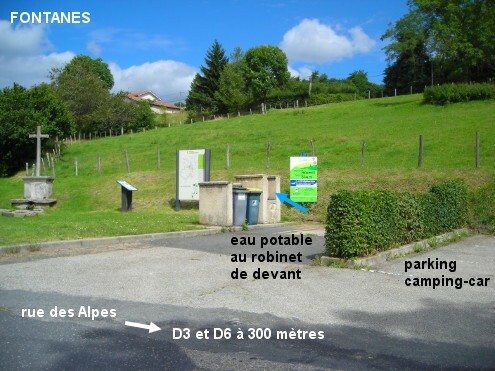L'aire pour camping-car est située à 300 mètres de l'intersection Sud D3 / D6. En provenance de Saint-Christo-en-Jarez par la D6, lorsque l'on arrive sur la D3, prendre en face la petite route qui part sur la droite (presque parallèle à la D3 en direction du bourg de Fontanès). Il y a une flèche indiquant la direction de l'aire pour camping-car. Le bloc en ciment sur lequel sont fixés les robinets est implanté côté droit après le parking pour les camping-cars et derrière une haie. N.B.: Le robinet qui délivre de l'eau potable est celui sur la face avant, reconnaissable à son filetage qui permet de raccorder le tuyau pour remplir les cuves des camping-cars (renseignement pris auprès d'un camping-cariste, en l'absence d'écriteaux concernant la nature de l'eau sortant de chacun des robinets). Le robinet sur la face arrière et situé au-dessus d'une trappe (destinée à la vidange des boites amovibles des WC chimiques) sert de l'eau de rinçage, impropre à la consommation.