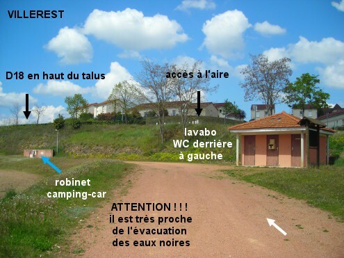 L'aire de camping-car de Villerest est située à côté de la plage et du barrage sur le lac de Villerest. Sur la D18 en provenance du bourg de Villerest et en direction de Commelle-Vernay, avant l'intersection avec la D84 direction Roanne et le pont sur le barrage, il y a à droite l'accès à l'aire de camping-car (à vélo on passe facilement à côté de la barrière qui se soulève barrant la passage aux véhicules non autorisés). Cette allée descend et fait un virage à droite. En face au fond on voit la dalle et le muret typiques des aires de camping-car. Attention : une affiche plastifiée nous alerte sur les risques pour l'hygiène, de la proximité du robinet d'eau potable avec l'évacuation des eaux noires. En cas de doute, préférer les toilettes dans le bâtiment à l'entrée du site.