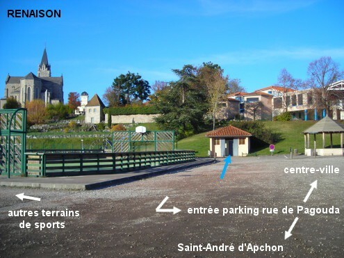 Ces toilettes sont situées à côté des terrains de sports. En provenance de Saint-André d'Apchon par la petite route parallèle à la D8 (route de Saint-André), 370 mètres après le panneau marquant le début de la ville, après l'intersection à gauche avec la rue des Rivières (à cet endroit la route sur laquelle on circule devient la rue de Pagouda), entrer à gauche sur l'immense parking en terre battue qui est à côté de plusieurs terrains de sports. Le petit bâtiment des toilettes est situé vers le fond sur le bord droit du parking, à côté d'un grand kiosque octogonal. N.B. : En provenance du centre-ville, au carrefour principal prendre la rue de Pagouda en suivant la direction du complexe sportif. Les toilettes sont alors à 280 mètres sur la droite vers la fin de la descente, et directement accessibles par une étroite allée piétonne au niveau du kiosque facilement repérable.