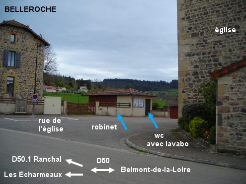 Ces toilettes se trouvent vers la Mairie et derrière l'église, au fond d'une place sise au bord de la D50 près du carrefour D50 / D50.1. Sur la D50 en direction du col des Écharmeaux, lorsque l'on arrive face à l'église érigée côté droit, on peut passer soit d'un côté soit de l'autre. Si l'on continue sur la route à gauche de l'église, tourner ensuite à droite derrière l'église et juste avant le carrefour D50 / D50.1 (il y a des flèches ''Mairie'' et ''toilettes''). Le petit bâtiment des toilettes est au fond de la place côté gauche, à gauche avant l'entrée dans la cour située devant la Mairie implantée sur la droite. Si l'on a pris la rue à droite de l'église, on arrive ensuite pile en face du bâtiment des toilettes. N.B. : En plus du lavabo à l'intérieur des toilettes, il y a un robinet extérieur sur le mur du bâtiment, à gauche de la porte des toilettes.
