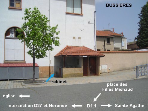 Ces toilettes sont implantées au fond d'une très grande place située à côté de l'église. Sur la D1.1 en provenance de Sainte-Agathe-en-Donzy (suivre les flèches "salle d'animation" et "WC publics") et juste avant l'intersection avec la D27, au niveau du virage à gauche on voit l'église sur le côté droit de la rue du 14 juillet et la place des Filles Michaud sur la droite. Le cabanon des toilettes est très en retrait par rapport à la rue, contre un mur tout au fond de ladite place. Le robinet est fixé au mur à gauche du cabanon des toilettes (qui ne comportent pas de lavabo).