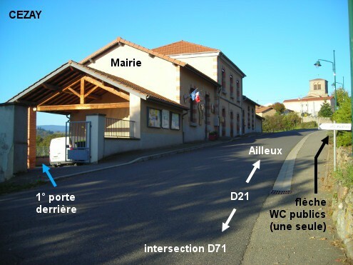 Les toilettes sont situées à l'arrière du bâtiment de la Mairie. Sur la D21 en direction d'Ailleux, 300 mètres après l'intersection avec la D71 en provenance d'Albieux, une flèche sur le bord de la route indique les ''WC publics'' (visible uniquement dans ce sens de circulation, dans l'autre sens c'est 460 mètres après le panneau de début du village) : il faut entrer à gauche dans la cour de la Mairie dont le portail est grand ouvert (constaté un samedi matin). Se diriger vers la droite au-delà de l'abri pour véhicules de service, la première porte à l'arrière du bâtiment est celle des toilettes. N.B. : Le lavabo est peu profond.
