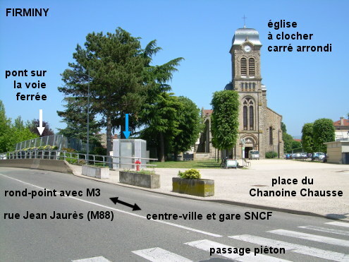 Ces toilettes se trouvent au début du grand parvis piéton situé devant l'église de la Présentation-de-la-Vierge, qui a un clocher carré arrondi (il y a deux églises en ville) et qui est au bord de la M88 qui traverse le centre-ville, près du rond-point avec la M3. Il s'agit d'une cabine WC autonettoyante (il y a aussi des urinoirs à l'arrière) équipée d'un lavabo-boite tri-fonction avec cellule à détection pour la commande de l'écoulement de l'eau. N.B. : Le jet d'eau est très puissant et rebondit au fond du lavabo, ça éclabousse très fortement (vers la droite). 1) Au sortir de la gare SNCF, faire le crochet à droite en suivant le sens obligatoire pour aller prendre l'avenue de la Gare qui est en face de la gare. Aux feux tricolores, tourner à gauche (rue Jean Jaurès, portion de la M88), puis peu après d'autres feux tricolores entrer à droite sur le parvis de l'église. La cabine WC est sur le côté gauche près de la route et à côté du début du cheminement piéton protégé qui franchit le pont sur la voie ferrée juste avant le rond-point avec la M3. 2) En provenance du Chambon-Feugerolles sur la M88 (si on fait le Tour de la Loire en suivant au plus près les limites du département, on ne peut faire autrement que de traverser les trois grosses agglomérations du Chambon-Feugerolles, de Firminy et d'Unieux qui se touchent, avant de retrouver des routes plus tranquilles), au rond-point avec la M3 (décoré d'un vieux véhicule de Pompiers) prendre la quatrième et dernière sortie en direction du centre-ville (la flèche est presque effacée, mais il y a une autre flèche visible : ''toutes directions'', et on voit déjà l'église) pour passer aussitôt au-dessus de la voie ferrée. Juste après, traverser sur le passage piéton pour rejoindre le parvis de l'église et les toilettes sur le côté gauche de ce parvis.