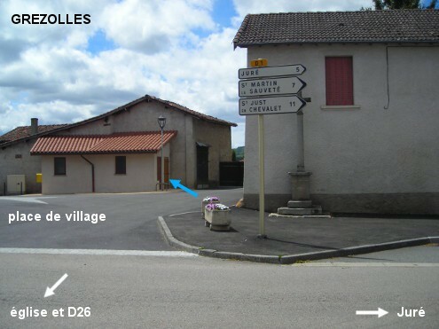 sur la droite d'un bâtiment situé entre la rue de Val d'Aix et la rue de la Cure en face de l'intersection avec la D26 direction Souternon, et devant lequel il y a un parking longeant la D1 presque en face de l'église