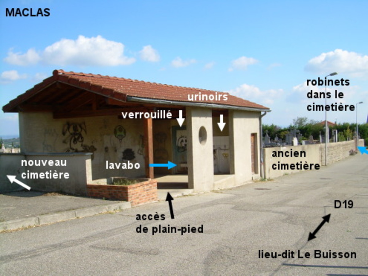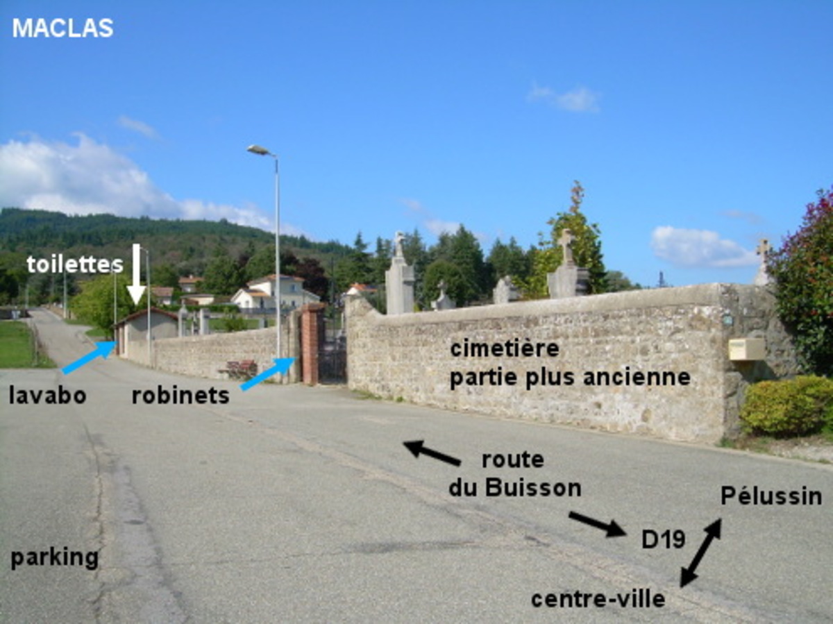 Ces toilettes sont accolées au cimetière (fléché) qui est situé dans la rue menant au lieu-dit Le Buisson, à 180 mètres de la D19 direction Pélussin. N.B.1 : En plus du grand lavabo dans les toilettes, il y a un duo de robinets dans le cimetière à gauche du portillon. 1) En venant de Félines sur la D242 qui devient D19 en changeant de département, au carrefour en T avec la D503, tourner à droite puis presque aussitôt à gauche avant l'église érigée côté gauche, dans la suite de la D19 en direction de Pélussin. Plus loin, tourner à gauche en direction du cimetière (en suivant la grosse flèche à côté de celle indiquant la suite de la D19 à droite sur cet embranchement en Y). Le cimetière est implanté côté droit 180 mètres plus loin. 1a) Entrer par le portillon (à gauche du portail) pour trouver tout de suite à gauche les deux robinets sur la même arrivée d'eau. N.B.2 : L'eau coule sans gicler sur celui des robinets sur lequel est serti un petit bout de tuyau. 1b) Ou bien continuer sur 60 mètres pour arriver à hauteur du bâtiment de type halle, accolé dans le coin entre l'ancienne partie du cimetière et la partie plus récente qui est en retrait. Le lavabo est au dos du pan de mur qui est au milieu de la face avant de ce bâtiment. N.B.3 : Il y a deux urinoirs en service sur la droite, mais par contre la supposée cabine WC dans le coin au fond à droite était fermée début octobre 2025. 2) En provenance du lieu-dit La Garde sur la D19, après le panneau de limitation de vitesse à 50 km/h, tourner en épingle dans la deuxième à droite en direction du cimetière qui est implanté côté droit 180 mètres plus loin. 3) En provenance de Lupé sur la D503, après le panneau marquant le début de la ville tourner dans la première à droite en direction du lieu-dit le Buisson, et de Pélussin (itinéraire P.L. évitant le centre-ville). Suivre ensuite le virage à gauche et rouler tout droit jusqu'au carrefour en T avec la D19 direction Pélussin. Tourner à droite en direction de Pélussin puis peu après à gauche en direction du cimetière implanté plus loin côté droit.