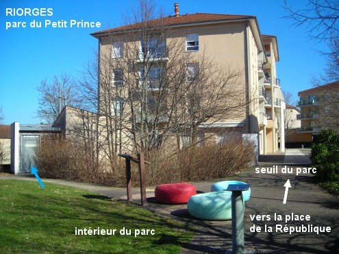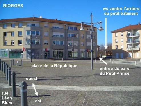 Ces toilettes sont situées dans l'enceinte du parc municipal du Petit Prince, dans le quartier ''Riorges centre'' (suivre aussi les flèches ''commerces'', ceux du centre-ville).1) A partir de la D9 en provenance de Roanne (présence de bandes cyclables), aux feux tricolores à côté d'un supermarché, tourner à droite (rue Jules Faron) puis au rond-point tourner à gauche (rue Léon Blum). Continuer jusqu'à voir un îlot central ovoïde délimité par des potelets, à côté de l'arrêt de bus ''place centrale''. Cette place est implantée à gauche, tandis qu'à droite c'est l'immense ''place de la République'', pavée. Au fond de cette deuxième place (en face et à notre droite par rapport à notre sens de circulation) on trouvera l'entrée du parc (descendre de vélo). Se diriger vers la droite : contourner le bosquet pour trouver derrière le petit bâtiment que l'on voit depuis l'extérieur, la cabine des WC. Il s'agit d'une cabine à désinfection automatique équipée d'un lavabo avec cellule à détection (placer les mains suffisamment haut pour déclencher l'écoulement de l'eau). Par cet itinéraire, les toilettes sont à 800 mètres de la D9. 2) Dans l'autre sens de circulation sur la D9, tourner à gauche devant le cimetière (rue Jean Reboul), puis à droite au rond-point décoré de vaches blanches, la place de la République sera alors située côté gauche peu après, et les toilettes à 580 mètres de la D9.