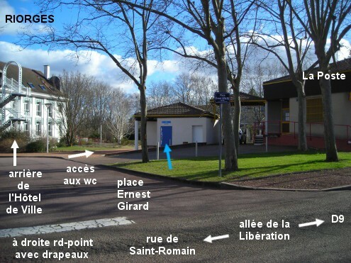 Ces toilettes sont situées dans le quartier ''Riorges centre'', derrière l'Hôtel de Ville, à 600 mètres de la D9. A partir de la D9 en provenance de Renaison, aux feux tricolores du carrefour qui précède le rond-point au-dessus de la rocade (on le voit depuis les feux), tourner à gauche en direction de la Mairie (rue Pasteur). Aller jusqu'au rond-point où il y a les drapeaux des pays des villes jumelées avec Riorges (l'Hôtel de Ville est sur la gauche) et tourner à gauche (rue de St-Romain) puis aussitôt après le sens interdit (sortie du parking) tourner encore à gauche (allée de la Libération) puis entrer à gauche sur le parking (place Ernest Girard). Le petit bâtiment des sanitaires est implanté côté droit, plusieurs mètres avant l'arrière de la Mairie et à côté de l'arrière du bureau de Poste.