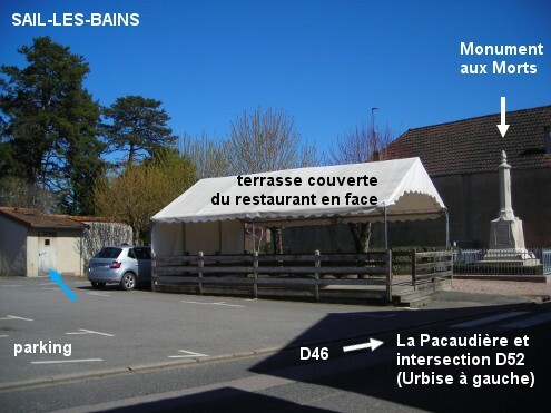 Les toilettes sont situées au fond du parking implanté côté gauche le long de la D46 en direction de La Pacaudière, juste avant le Monument aux Morts et en face d'un restaurant, peu avant l'intersection à gauche avec la D52 en direction d'Urbise. Aller au fond du parking sur la droite duquel est installée la grande terrasse couverte du restaurant, pour trouver après cette tente blanche, le petit bâtiment des toilettes (intérieur d'aspect neuf). N.B. : Le robinet sur la façade extérieure est concerné par une coupure d'eau hivernale, mais pas le lavabo à l'intérieur des toilettes.