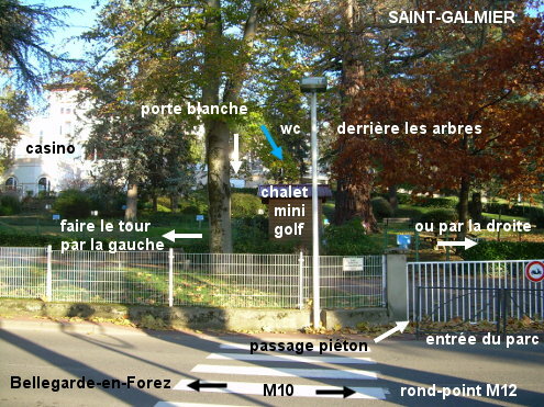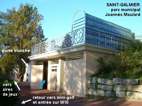 Ces toilettes se trouvent dans une partie d'un ensemble de bâtiments mitoyens situés au milieu du parc municipal Joannès Moulard (au bord duquel est aussi implanté le casino, côté centre-ville) qui est longé par la M10 à proximité du rond-point avec la M12. 1) En provenance de Rivas sur la D101 (M101 nouvelle appellation), au rond-point avec la M12 tourner à gauche dans la M12 (autres directions), continuer tout droit aux feux du carrefour à droite avec la M10 venant de Chamboeuf, et tout droit au rond-point suivant (M12 superposée avec la M10). Un moment après, au troisième rond-point sur la droite et derrière lequel on voit les lettres ''casino'' plantées au-dessus de l'herbe, continuer tout droit (M10) pendant 110 mètres puis entrer dans le parc par le portillon à droite (face au passage piéton). On est alors face à un mini-golf que l'on peut contourner soit par la gauche (100 mètres) soit par la droite (90 mètres). 1b) En montant par la droite, on arrive en T presque en face des toilettes qui sont légèrement à gauche. 1a) En montant par la gauche, à cet autre T aller à droite au-delà d'une grande porte blanche pour trouver les toilettes dans les bâtiments à gauche de l'allée.