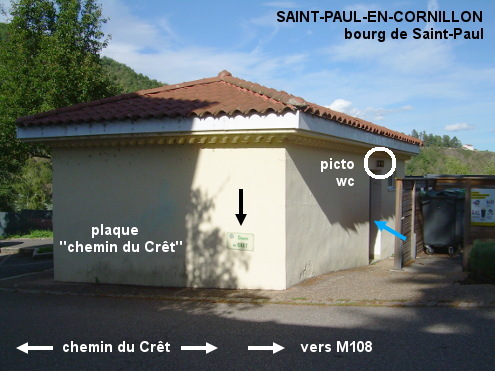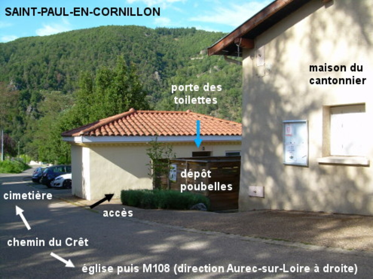 Les toilettes se trouvent dans l'ancien bourg de Saint-Paul au bord de sa rue principale (qui passe devant son église) à 190 mètres de la M108. 1) En provenance d'Aurec-sur-Loire sur la D46 qui devient M46 puis M108 en changeant de département, à l'entrée d'un virage à droite tourner à gauche en direction du bourg de Saint-Paul (petite flèche ''église Sainte-Madeleine'' parmi d'autres). Suivre cette rue, dépasser l'église érigée côté gauche, on arrivera ensuite vers la ''maison du cantonnier'' sise côté droit. Juste après celle-ci et un enclos à poubelles à palissades en bois, on verra le bâtiment des toilettes. Prendre l'allée entre ce bâtiment et la palissade en bois pour accéder à la porte des toilettes surmontée d'un panonceau avec le pictogramme ad-hoc. 2) En provenance de Chambles sur la M108 (au carrefour avec la M3 tourner à gauche pour franchir le pont du Pertuiset sur la Loire puis au rond-point tourner à droite dans la suite de la M108 en direction du village), ignorer la première rue à droite en direction de ''Saint-Paul'', continuer tout droit et après le panneau ''Saint-Paul-en-Cornillon'', sur l'extérieur d'une courbe à gauche, tourner à droite en épingle en direction de l'église (petite flèche parmi d'autres) puis suivre la rue jusqu'au bâtiment des toilettes situé côté droit avant un parking.