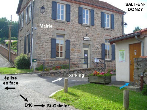 Le petit bâtiment des toilettes est situé en face de la Mairie au bord de son parking. Sur la D10 en direction de Saint-Galmier, tourner à gauche en suivant les flèches "Mairie" et "WC public" (il y a le Monument aux Morts à l'angle), le petit bâtiment des toilettes est implanté quelques mètres plus loin côté droit au bord de la rue, en face de l'église qui est du côté gauche. Il y a une première partie côté rue avec urinoirs et lavabo, et une deuxième partie à l'arrière côté parking avec WC et lavabo.