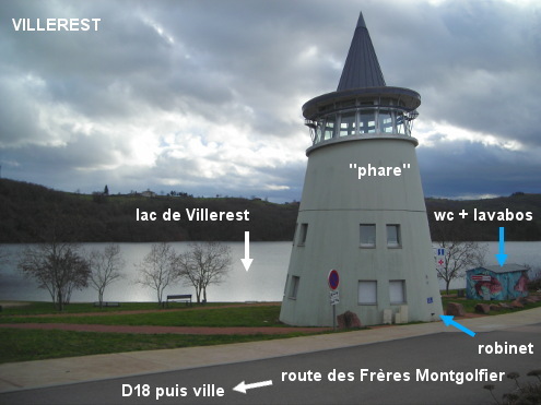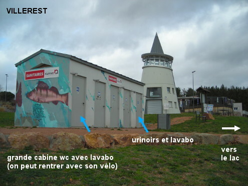 Ces toilettes se trouvent à côté de l'emblématique phare de la plage de Villerest au bord du lac situé à la périphérie de la zone urbanisée, à 270 mètres de la D18. 1) Sur la D18, à partir du barrage sur le lac, tourner à gauche dans la suite de la D18 en direction de Villerest puis 50 mètres après le panneau de début de zone urbaine, tourner à gauche (le panneau avec un ensemble de petites flèches, dont celle ''mise à l'eau, plage'', est positionné côté gauche sur la D18 après le carrefour !). Continuer tout droit jusqu'à dépasser le ''phare'' (bâtiment pas très haut en forme de cône, qui abrite le point d'informations touristiques et un poste de secours) implanté côté gauche, pour trouver une trentaine de mètres après, le bâtiment rectangulaire des sanitaires (décoré dune fresque peinte comportant des poissons). Ses cinq portes sont situées côté lac et donnent chacune dans une cabine avec un lavabo. N.B. : Il y a aussi un robinet d'eau potable (cela est confirmé par un écriteau) sur l'extérieur du phare côté route et positionné très bas (sur ce robinet l'eau est coupée en hiver). 2) Sur la D18 en provenance de la ville, on est très susceptible de louper la route menant à la plage : absence de présignalisation, légère descente, virage à gauche qui empêche de voir de loin le panneau de fin de zone urbaine. Il faut être attentif et tourner à droite lorsque la D18 vire à gauche (430 mètres après le rond-point de la Lie).