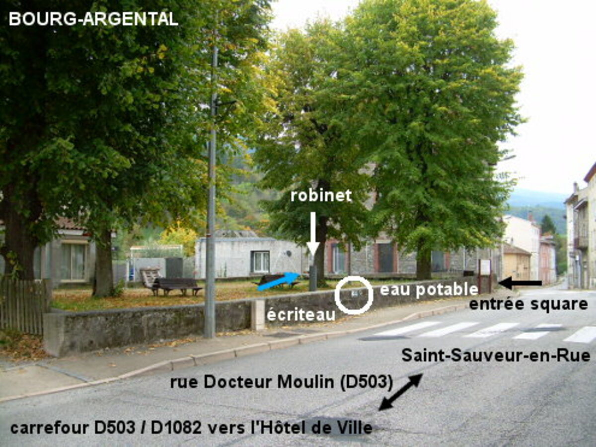 Ces toilettes et ce robinet se trouvent à proximité de la Gendarmerie (fléchée) qui est proche de la D503 direction Saint-Sauveur-en-Rue. Le robinet est au bord d'un square arboré implanté au bord de la D503. Quant aux toilettes, elles sont situées à 10 mètres de la D503, près de l'angle de deux rues qui est presque en face de la Gendarmerie. 1) En venant de Saint-Julien-Molin-Molette sur la D503, au stop avec la D1082 à très grande circulation (sur laquelle elle se superpose) tourner à droite (en direction du centre-ville), dépasser aussitôt le carrefour à gauche avec la D29 venant de Burdignes, puis au carrefour juste après l'Hôtel de Ville sis côté gauche tourner à gauche en direction de Saint-Sauveur-en-Rue dans la D503 (tronçon à très grande circulation). 1a) Plus loin, après l'église et le stop, après un premier passage piéton, en face d'un autre passage piéton, on verra côté gauche un square piéton arboré bordé d'un muret sur l'extérieur duquel il y a face à ce passage piéton, un écriteau vert ''eau potable'' au niveau d'un support à section carrée sur lequel est fixé un robinet à l'intérieur du square. Continuer sur quelques mètres pour trouver l'entrée du square à la fin de celui-ci vers un troisième passage piéton (deux marches d'escaliers puis une dizaine de mètres sur l'herbe à parcourir jusqu'au robinet). 1b) Côté droit, derrière le carrefour avec une rue adjacente, on verra deux petites flèches dont celle de la Gendarmerie, en regard du milieu du square précité. Une fois que l'on a tourné à droite dans ce boulevard Émile Girodet (dont la suite est en sens interdit) on verra la Gendarmerie côté droit derrière une rue adjacente en impasse et les toilettes côté gauche au début d'une autre rue adjacente (rue Melon).