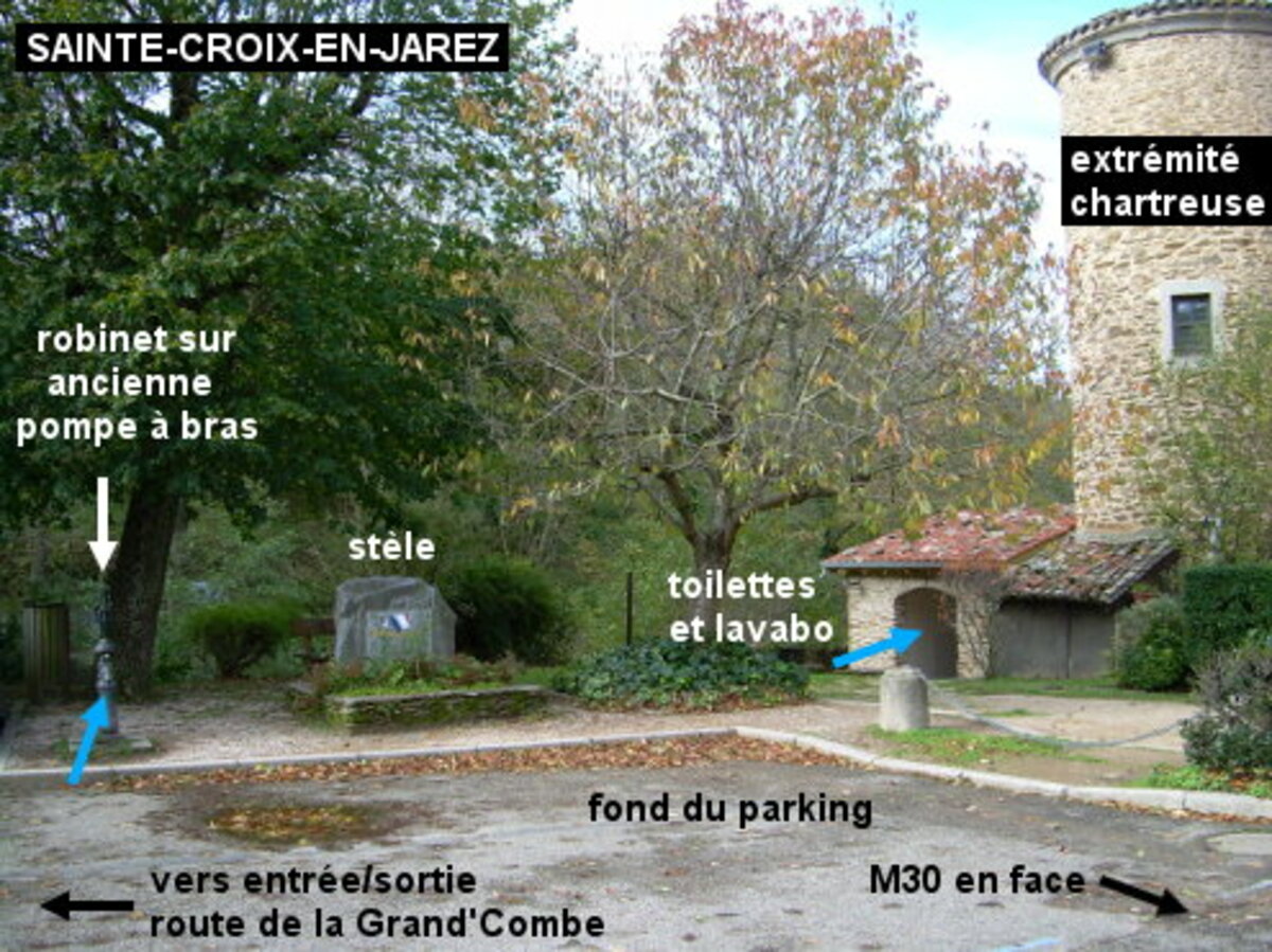 Ces toilettes se trouvent à l'extrémité gauche sur le devant de l'enceinte fortifiée de l'ancienne chartreuse qui est au bord de la M30. On pourra aussi trouver un robinet monté sur une ancienne petite pompe à bras située au bord du parking qui est devant la partie de la chartreuse à gauche de son porche. 1) En provenance de La Chapelle-Villars et du col de Grenouze sur la D78 qui devient M78, au carrefour en T sur la M30 tourner à gauche. On voit déjà l'immense enceinte de l'ancienne chartreuse érigée à droite de la M30 juste avant que cette dernière ne fasse un coude à gauche. Juste après le porche qui donne accès à l'intérieur de la chartreuse tandis que la M30 part à gauche, prendre tout droit l'allée piétonne qui longe la façade extérieure. À la fin de l'allée cimentée, faire les derniers mètres sur la terre battue à gauche. 1a) Ensuite descendre les quatre marches d'escaliers menant à l'entrée des toilettes (à 30 mètres de la M30). N.B. : À droite des urinoirs situés au fond sur la gauche, il y a un lavabo (bien incliner le bidon pour le placer sous le jet) et aussi un robinet supplémentaire (l'eau gicle sur ce robinet-vanne). 1b) En coupant à travers vers la gauche, on rejoindra le parking et on trouvera l'ancienne pompe à bras et son robinet (à 10 mètres des toilettes) à gauche d'une stèle en bordure de parking (sur son côté droit quand on est dos à la chartreuse). 2) En descendant du col de Pavezin sur la M30 en direction de Rive-de-Gier, peu avant d'arriver face au porche de la chartreuse tourner à gauche dans la rue adjacente puis aussitôt à droite pour entrer sur le parking qui est devant l'aile gauche de la chartreuse. 2a) Avancer jusqu'à trouver le robinet sur l'ancienne pompe à bras (à 22 mètres de la M30) sur le côté gauche peu avant la fin du parking, et à gauche d'une stèle érigée au bord du parking. 2b) En allant à pied au-delà de la fin du parking, on arrivera vers les escaliers descendant vers l'entrée des toilettes à l'extrémité de l'enceinte de l'ancienne chartreuse.