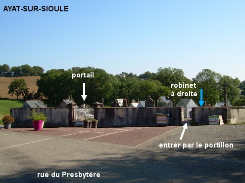 Le cimetière est situé dans une rue secondaire à proximité de l'église, à 120 mètres de la D99. Son robinet se trouve à l'intérieur au-dessus d'un évier, à droite du portillon, qui est près de l'extrémité droite du mur. 1) En provenance de Sainte-Chiristine sur la D99, lorsque l'on verra côté droit le Monument aux Morts (avec une statue de ''poilu'') et à gauche dans la fourche du carrefour en Y avec une rue adjacente le Monument au Général Desaix (immense stèle accompagnée de deux canons), tourner à gauche dans la rue de l'église puis à gauche juste avant l'église. On verra alors le cimetière en face quelques mètres plus loin. 2) En provenance de Châteauneuf-les-Bains sur la D109 puis la D99, peu après la Mairie sise côté gauche, tourner à droite juste après le Monument puis à gauche juste avant l'église pour trouver le cimetière quelques mètres plus loin et en face.