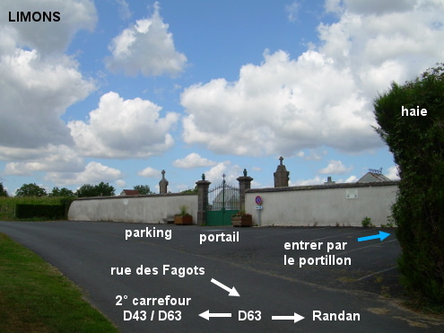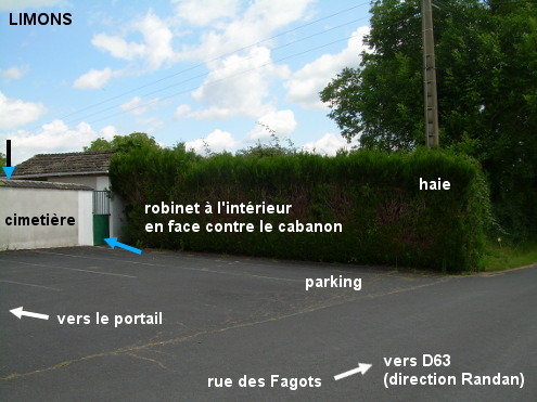 Le cimetière (fléché) est situé dans une rue secondaire, à 300 mètres de la D63 quand on suit la direction de Randan. Sur la D63 en provenance de Puy-Guillaume, au rond-point tourner à droite dans la D43 et 200 mètres plus loin tourner à gauche en direction de Randan sur la suite de la D63. Tourner ensuite dans la première à gauche 160 mètres plus loin en direction du cimetière, pour le trouver implanté côté droit, en retrait par rapport à la route, après une haie qui ne permet de le voir qu'au dernier moment. Entrer par le portillon qui est à l'extrémité droite du mur, pour trouver le robinet fixé au cabanon qui est dans le coin à droite.