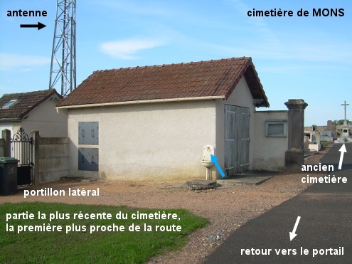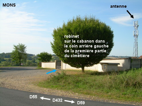 Le cimetière est situé à côté de la D432 qui passe à la périphérie du bourg. 1) Sur la D432 en provenance de la D59, on ne verra pas de panneau de début de village (par contre, dans l'autre sens il y a un panneau de fin), mais dans le faux-plat descendant on pourra se repérer à la grande antenne-relais installée à côté du cimetière implanté côté droit en retrait derrière une petite zone caillouteuse. Entrer dans le cimetière (N.B. : Pour débloquer le portail : soulever la targette reliée à une chaîne pour la retirer, écarter vers l'arrière la petite barre cylindrique qui solidarise les deux battants du portail, et enfin pousser le battant gauche. Ne pas oublier de refermer correctement avant de repartir). Avancer de 40 mètres sur l'allée intérieure asphaltée jusqu'à la séparation des deux parties du cimetière pour trouver le robinet au-dessus d'une vasque en faïence fixée sur le bâtiment qui est dans le coin gauche avant le pan de mur de séparation (P.S. : L'antenne-relais sus-citée est à l'extérieur juste à côté). 2) Dans l'autre sens de circulation, sur la D432 en provenance de la D55, bien après la carrefour à droite avec la rue menant au centre du village, on verra le cimetière côté gauche.
