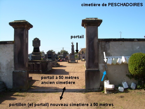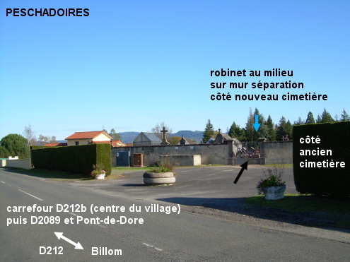 Le cimetière est situé à la périphérie nord du village. Il comporte deux parties et deux portails sur deux murs opposés donnant dans deux rues, avec un seul robinet se trouvant au milieu. 1) En provenance de Courpière sur la D223 puis la D212 qui passe à la périphérie ouest du bourg, surveiller attentivement le côté droit de la route car le cimetière n'est pas directement au bord mais très en retrait et masqué par deux parties de haie arbustive qui entourent son parking. Entrer alors sur ce parking asphalté et parcourir les 20 mètres jusqu'au portail, entrer, avancer de 50 mètres sur l'allée en terre battue jusqu'au passage entre l'ancien cimetière et le nouveau cimetière. On trouvera alors le robinet sur la gauche au dos du pan de mur, côté nouveau cimetière. 2) En provenance de Saint-Jean-d'Heurs (à la sortie du village sur la D115, tourner à gauche en direction du lieu-dit Bayle, traverser la D2089 pour prendre la D335 direction lieu-dit Les Ravaux, puis tourner dans la première à droite), on arrive ainsi à Pont-de-Dore par la ''Voie Romaine'' au carrefour avec la D2089 (à très grande circulation) juste avant le passage à niveau puis le carrefour avec la D212. Tourner à droite dans la D212 en direction du village (il n'y a apparemment pas de panneau de début !), puis tourner à gauche en direction du cimetière. Un peu plus loin, suivre encore la flèche ''cimetière'', qui pointe à droite l'accès à la partie plus récente du cimetière, qui est comme l'ancienne partie en retrait derrière une esplanade (ici en herbe) entourée de haies. Parcourir les 30 mètres d'allée asphaltée jusqu'au portail puis entrer par le portillon qui le jouxte. Avancer de 50 mètres sur l'allée en terre battue jusqu'au robinet que l'on aperçoit sur le pan droit du mur de séparation des deux parties du cimetière. P.S. : Au carrefour D2089 / D212, la rue face à la D212 passe par la gare de Pont-de-Dore et donne sur la D224 direction Maringues.