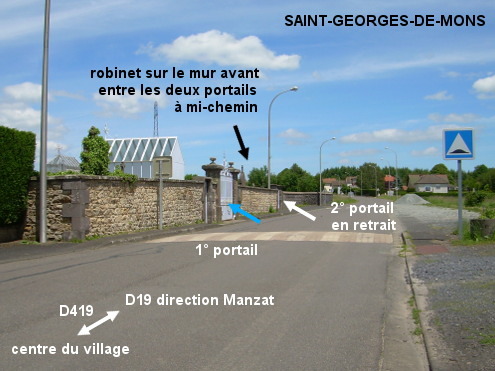 Le cimetière est implanté côté gauche à la sortie de la ville sur la D419 qui la dessert et dont les deux extrémités sont reliées à la D19. Il est composé de deux parties et ne comporte qu'un seul robinet situé à l'intérieur sur le mur avant, à égale distance des deux portillons qui sont chacun à côté d'un portail. 1) Sur la D90 en provenance de Paugnat, celle-ci débouche sur la D419 qui traverse la ville. Continuer tout droit jusqu'à voir le cimetière côté gauche juste après un dos d'âne. Entrer par le premier portillon (à côté du portail de gauche qui donne dans la partie la plus ancienne) et se diriger vers la droite pour trouver le robinet à 20 mètres (allée en gravillons de pouzzolane). 2) En provenance de Manzat sur la D19, au rond-point du lieu-dit La Croix-de-Pierre, tourner à gauche en direction de la ville. Le cimetière est implanté côté droit et son autre portillon (à côté du portail donnant dans la partie la plus récente) est situé 100 mètres après le panneau marquant le début de ville.