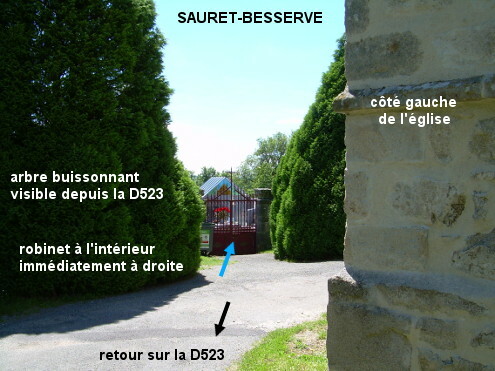 Le cimetière est situé derrière l'église qui est érigée au bord de la D523 en direction du viaduc des Fades. Il ne se voit pas du tout depuis la route, on n'aperçoit que le grand arbre buissonnant qui est à gauche de son portail. Le robinet est à l'intérieur du cimetière à droite du portail. En provenance de Saint-Gervais-d'Auvergne sur la D523, un moment après l'intersection avec la D513 venant à droite de Saint-Priest-des-Champs, on arrivera vers l'église érigée côté gauche. Prendre l'allée à gauche de l'église qui conduit jusqu'au portail du cimetière (à 50 mètres de la route).