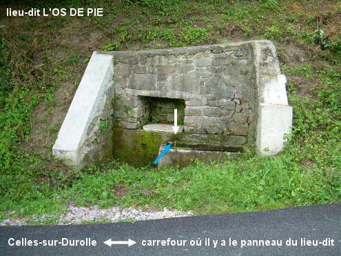 La fontaine se trouve à 70 mètres du carrefour dans lequel est planté le panneau de ce lieu-dit sur une route secondaire menant à Celles-sur-Durolle. En provenance de La Monnerie - Le Montel sur la D323 puis sur la petite route (à gauche environ 1,7 km après la fin de La Monnerie) au début de laquelle une flèche indique le raccourci pour aller à Celles-sur-Durolle, juste après avoir obliqué à gauche en laissant tout droit la direction du lieu-dit Martignat, on arrivera au carrefour où est planté le panneau marine du lieu-dit l'Os de Pie (rattaché à la commune de Celles-sur-Durolle). Tourner à droite en suivant la flèche Celles-sur-Durolle et descendre lentement pour ne pas louper la fontaine qui ne se voit pas de loin car située dans un renfoncement de la butte qui borde la route, 70 mètres plus loin côté droit. Elle s'écoule dans un bassin en pierre entouré de murets. AVERTISSEMENT : Elle n'est accompagnée d'aucun écriteau concernant sa potabilité, mais étant donné qu'elle a été rénovée, on peut penser que si elle avait été dangereuse, cela aurait été signalé.