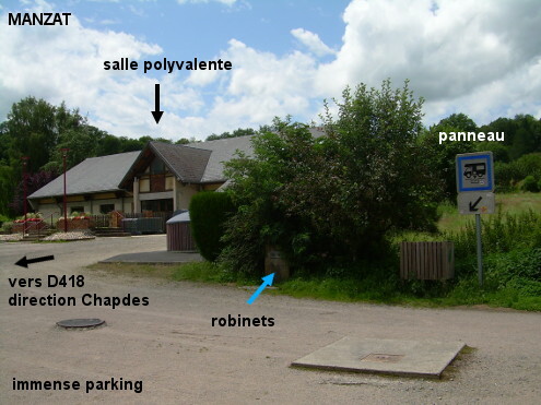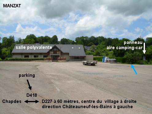 L'aire pour camping-car se trouve sur la droite de l'immense parking situé devant la salle polyvalente, implanté au bord de la D418 direction Chapdes et à 60 mètres du carrefour avec la D227. 1) Sur la D227 en provenance de Châteauneuf-les-Bains, avant le centre du village tourner à droite dans la D418 en direction de Chapdes et de l'aire pour camping-car. Juste après, entrer à droite sur le parking en terre battue et parcourir 50 mètres jusqu'à l'emplacement des robinets contre une haie arbustive (peu visibles de loin) à gauche du panneau avec le pictogramme des camping-car. N.B. : Il s'agit de deux robinets-vannes et l'eau gicle. 2) Sur la D418 en provenance de Chapdes, au rond-point à côté du cimetière tourner à gauche en direction de l'aire pour camping-car, que l'on trouvera 300 mètres plus loin côté gauche.